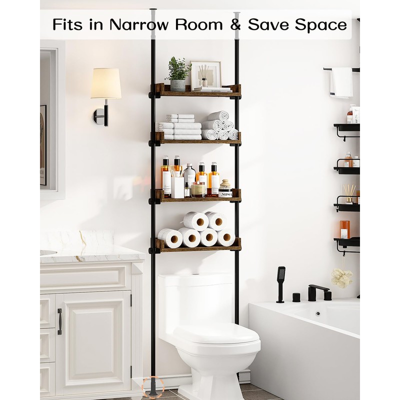 ALLZONE Bathroom Organizer, Over The Toilet Storage, 4-Tier Adjustable Wood Shelves for Small Rooms, Saver Space Rack, 92 to 116 Inch Tall, Narrow Cabinet, Rustic Brown