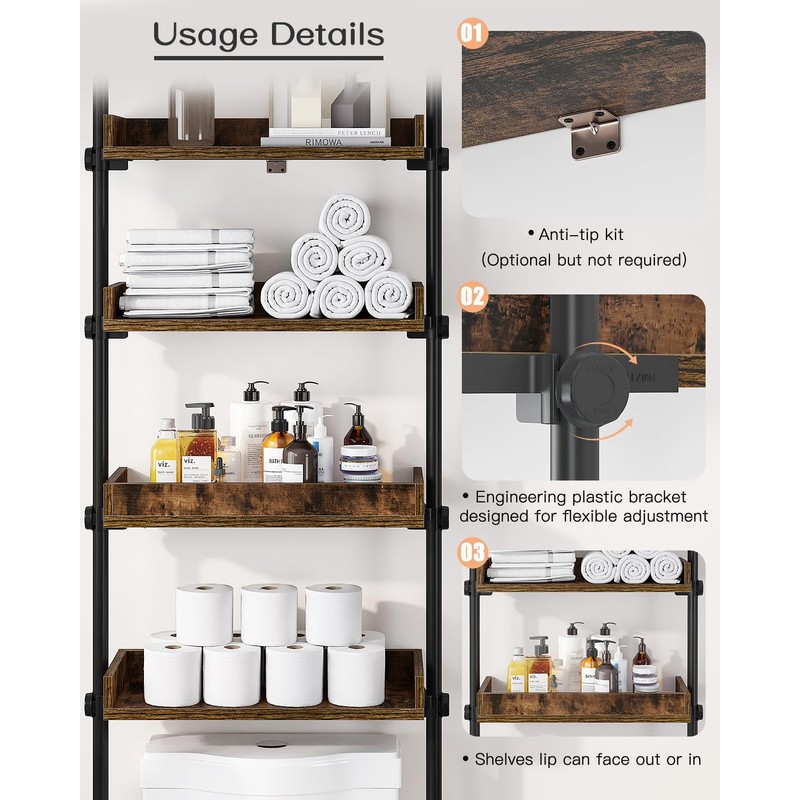 - [FITS OVER MOST TOILETS] Supported by floor and ceiling, you can fit this bathroom organizer virtually anywhere. Though you have a very small space above the toilet. This furniture can help you save your space and provides you additional bathroom storage.