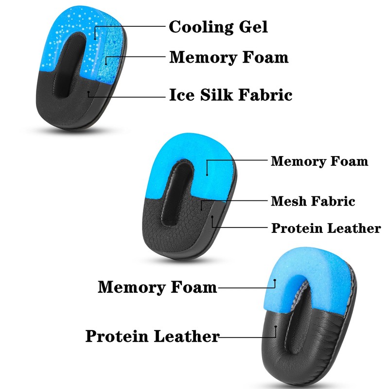 • Nuestro juego de productos incluye: 1 cojín de gel de enfriamiento, 1 cojín de piel de proteína y 1 cojín de tela de malla para los oídos, 3 espuma de micrófono, lo que te da la libertad de cambiar las almohadillas para orejas con las estaciones y actualizar tus auriculares