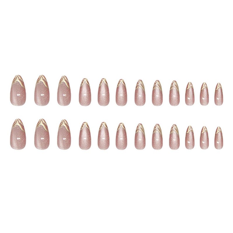 Almond Press on Nails Cat's Eye Fake Nails Medium False Nails Pink Glitter Stick on Nails French Tip Gold Glue on Nails Cute Glossy Artificial Nails for Women24PCS