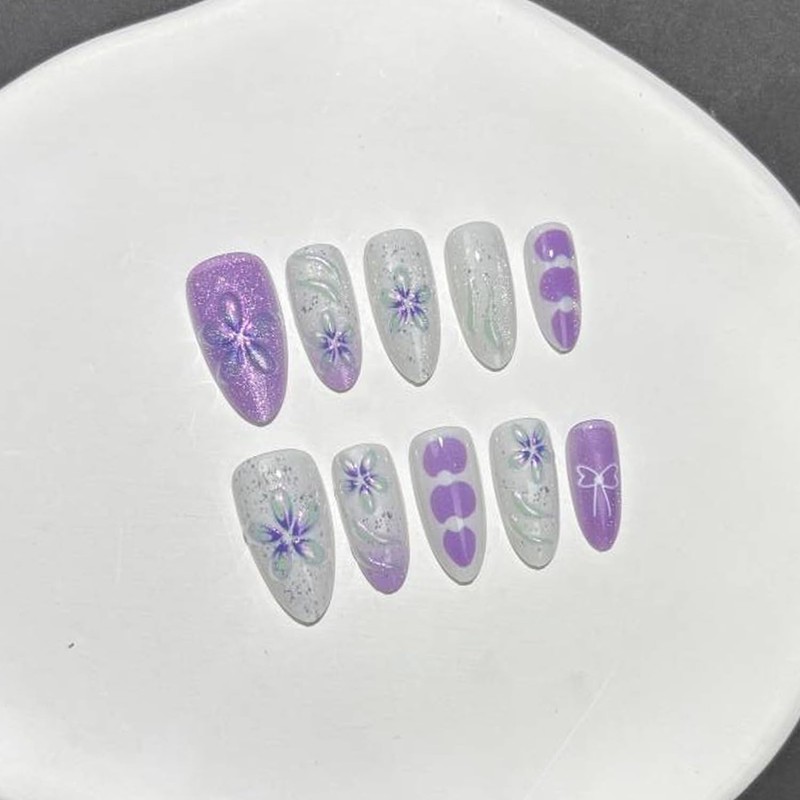 Almond Press on Nails Medium 3D Floral Fake Nails Purple&White False Nails with Pearls Bow Flower Gold Foil Designs Handmade Nail Pretty Glossy Glue on Nail for Women Girls 30Pcs