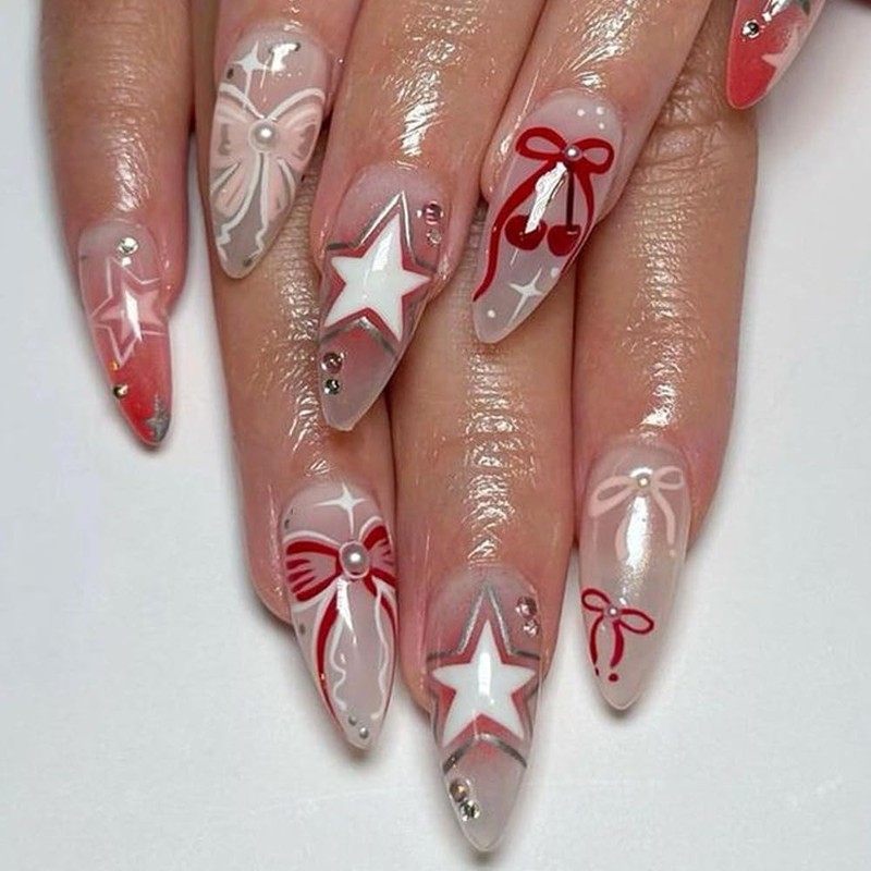 Almond Press on Nails Medium Fake Nails Pink Full Cover Pearl False Nails with Star Powder Blusher Bow Knot Rhinestone Designs Glossy Stick on Nails Reusable Nails for Women Girls 24 Pcs