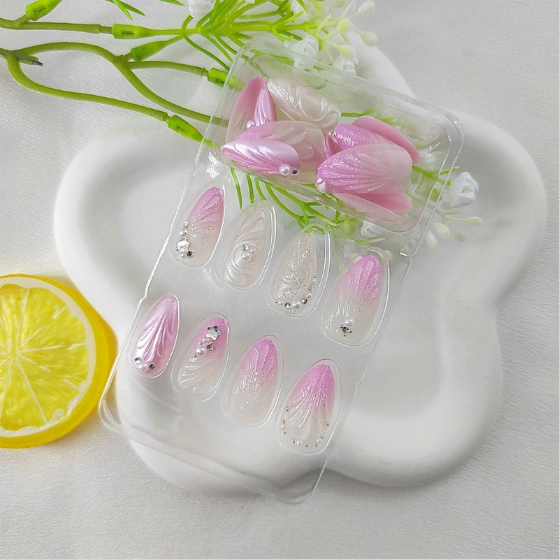 2. Choose the right size almond fake nails for your nails and stick the jelly stickers pearl glue on nails.