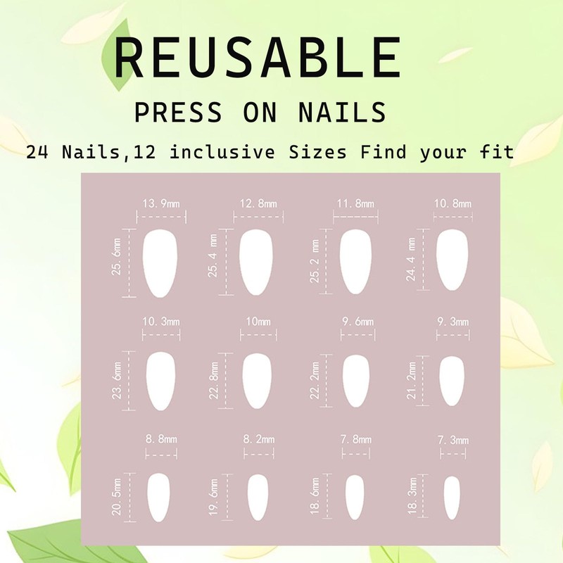 - Package includes: 24 pcs medium almond press on nails, 24 pcs jelly glue stickers, 1 nail file, 1 wooden stick, 1 alcohol pad, the fake nails are available in 12 different sizes, so it is convenient for you to choose the one that fits your nails