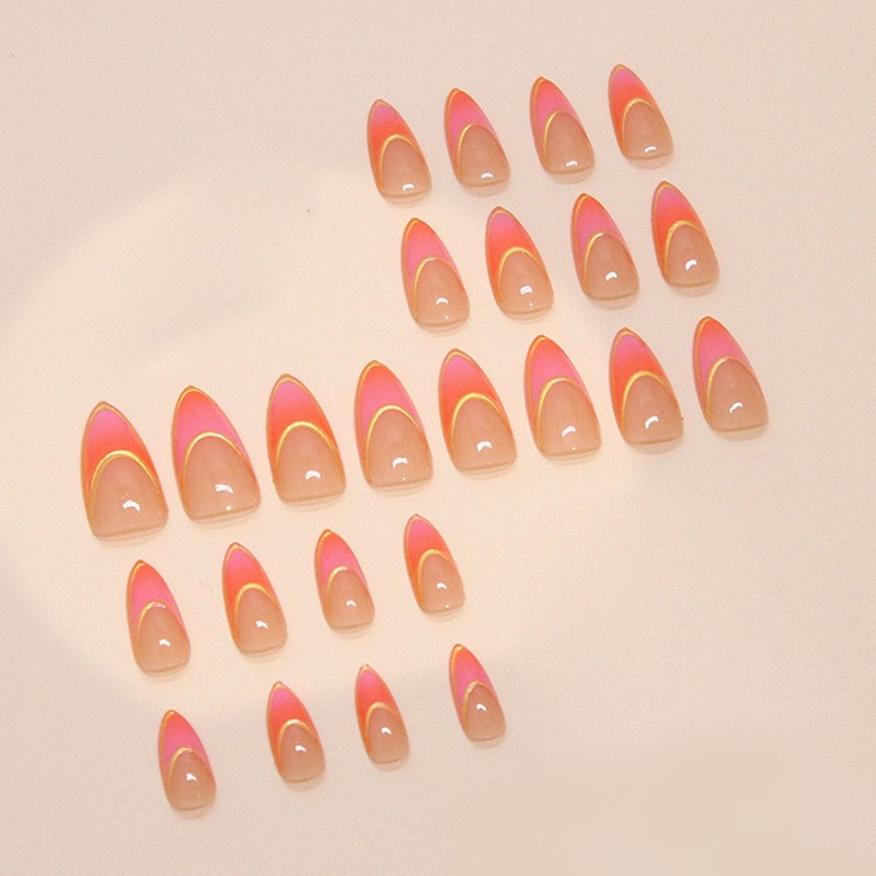 Almond Press on Nails Medium Fake Nails with Glod Lines & French Tip Designs Glossy Glue on Nails Orange Gradient False Nails Cute Acrylic Nails Nude Artificial Stick on Nails for Women 24Pcs