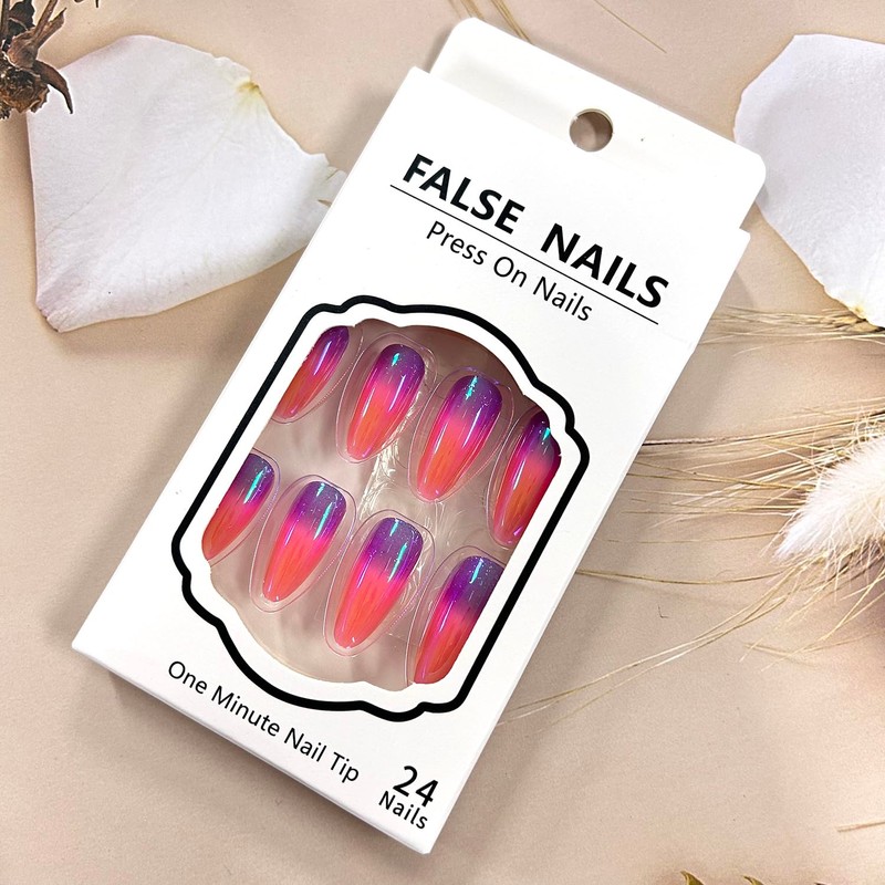 Almond Tip Press on Nails Medium Gradient Aurora False Nails Purple and Orange Design Full Cover Coffin Nails Artificial Stick on Nails Glossy Acrylic Nails Reusable Glue on Nails for Women 24Pcs