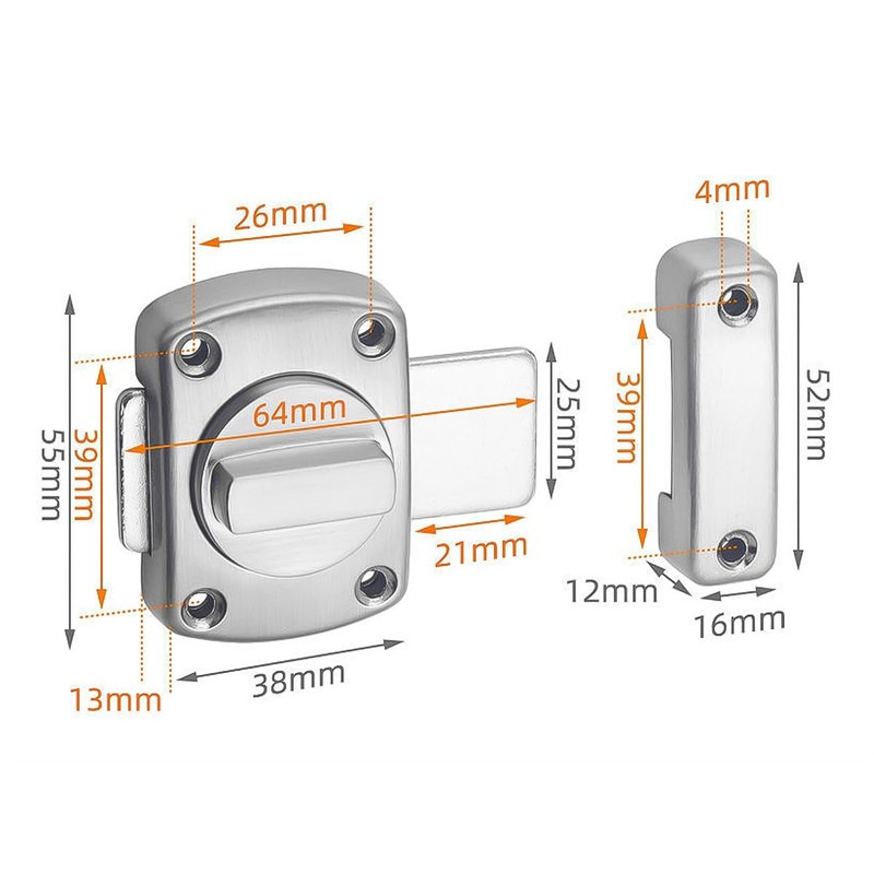 This bathroom lock comes with screws to install, can be installed on the left or right, turn to activate the mechanism, rotate to close.