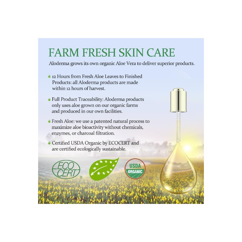 Aloderma: We are a family run farm-to-face skin care line focused on producing and creating high-quality organic aloe vera-based products in an ecologically friendly way. We grow organic aloe vera on our own farms and manufacture all of our products in our factory, which are certified USDA and European Union organic by ECOCERT. Aloderma has over 20 years of working with Aloe providing high quality and affordable products for beauty, health and wellness.