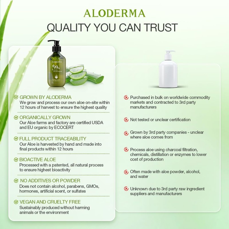 - MADE WITHIN 12 HOURS OF HARVEST: At Aloderma, our skincare is rooted in the earth. Our Aloe is processed on-site and turned into final products within hours of leaving the fields to ensure that we capture the natural power of Aloe Vera in every product we make.
