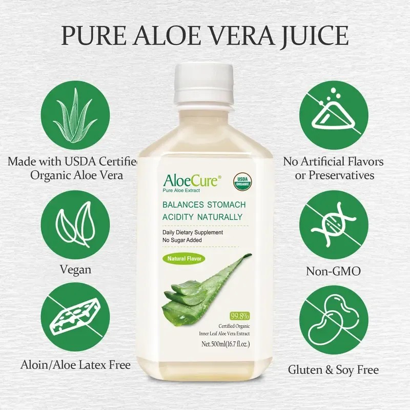 •Pure Vitality: Revitalize and rejuvenate your body and soul with the pure vitality of our Organic Aloe Vera Supplement. AloeCure aloe drink is crafted from the highest quality aloe vera inner leaf extract. It strengthens your gut with potent natural nutrients and makes you feel refreshed and invigorated.