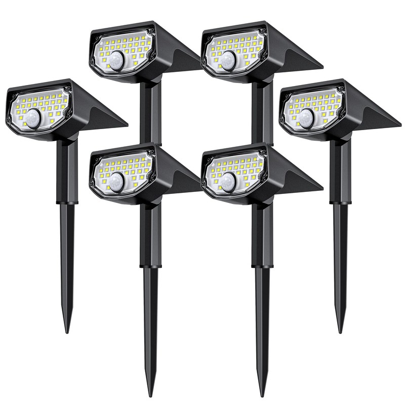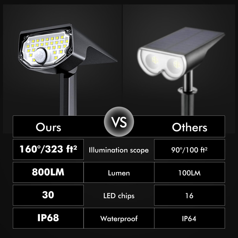 - EXTREMELY BRIGHT MOTION SENSOR SPOTLIGHTS:Our solar outdoor spotlights have 30 high-quality LED chips, providing brighter and more uniform illumination for your landscape. With a built-in PIR sensor, the 160° detection angle and 33ft sensing range can detect human, animals, and vehicles, but not wind, rainwater, or frost.