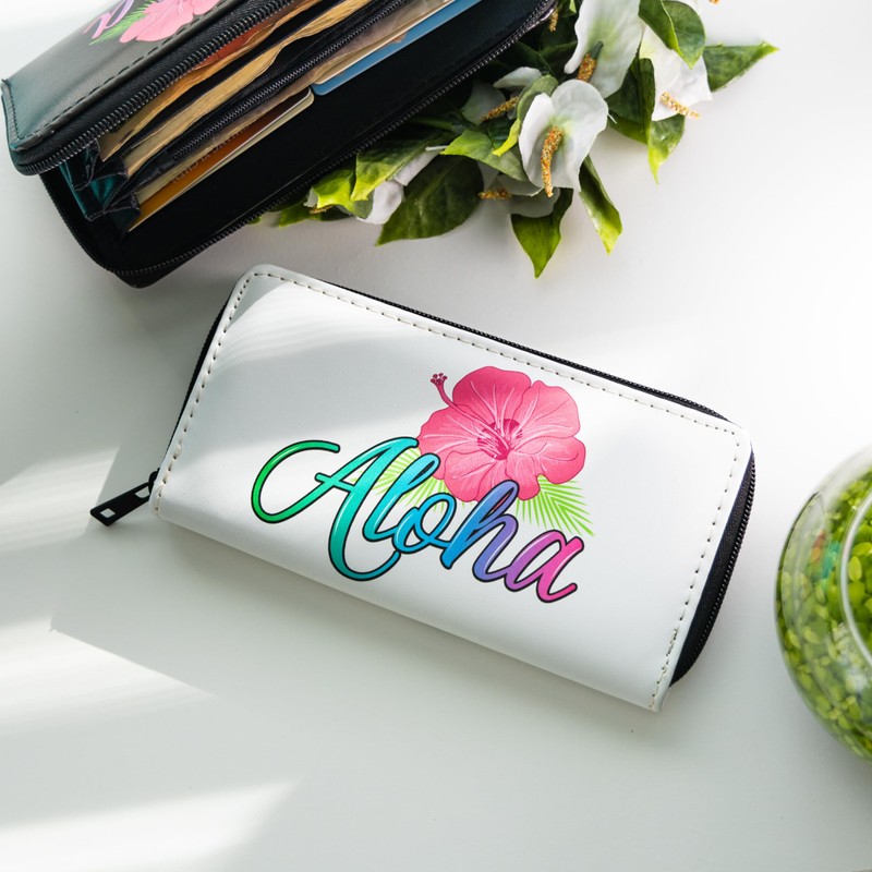 ALOHA Wallet Purse Long Leather Waterproof Cash Card Holder Cute Hawaiian Hibiscus Print Clutch Purse Holder Zipper Closure Mini Wristlet Coin Bag