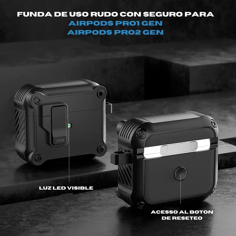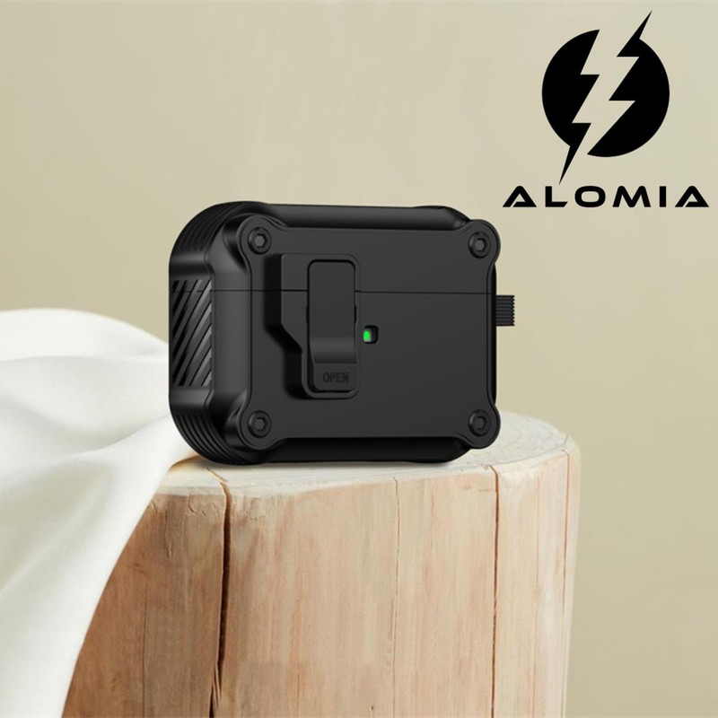 Alomia Funda Uso Rudo Compatible con AirPods Pro 2. Funda con Bloqueo de Seguridad. Protege de caídas, rayones y Polvo con Kit de Limpieza y 3 Pares de Almohadillas (S/M/L) (Color Negro)