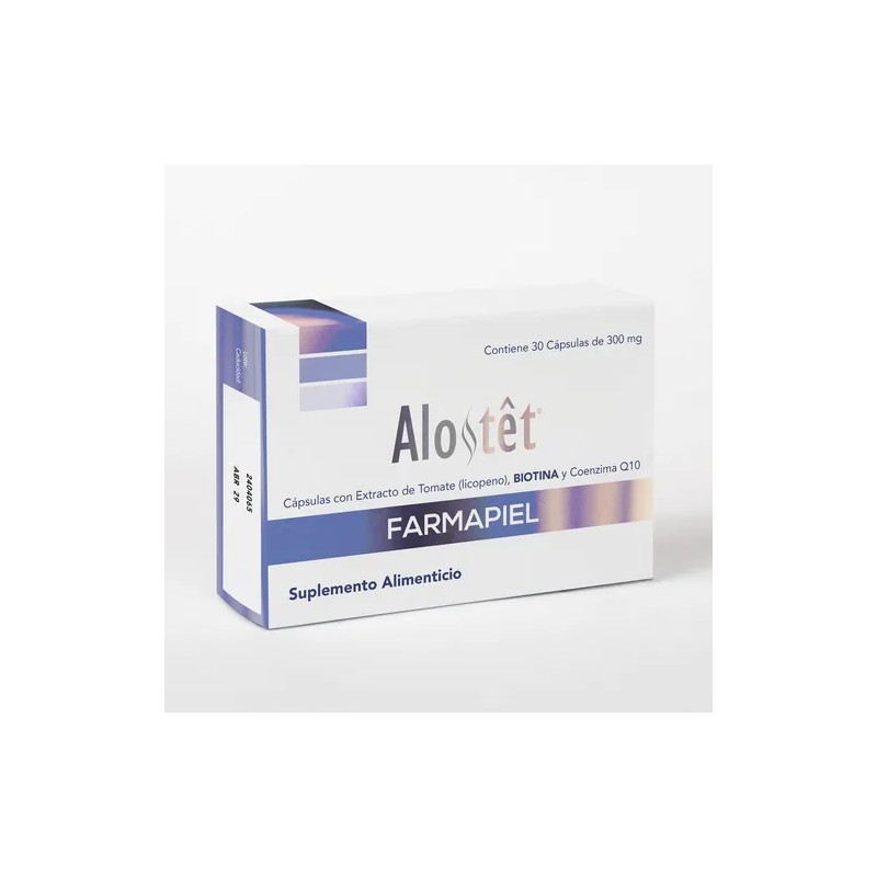 Alostet suplemento alimenticio, pastillas que contiene Extracto de Tomate (licopeno), BIOTINA y Coenzima Q10 entre otras vitaminas y minerales.