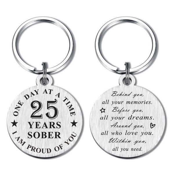 - 25 Years Sobriety Keychain Gifts for Women Men - 25 Years Sober, One Day At A Time, I Am Proud Of You. Behind you, all your memories. Before you, all your dreams. Around you, all who love you. Within you, all you need