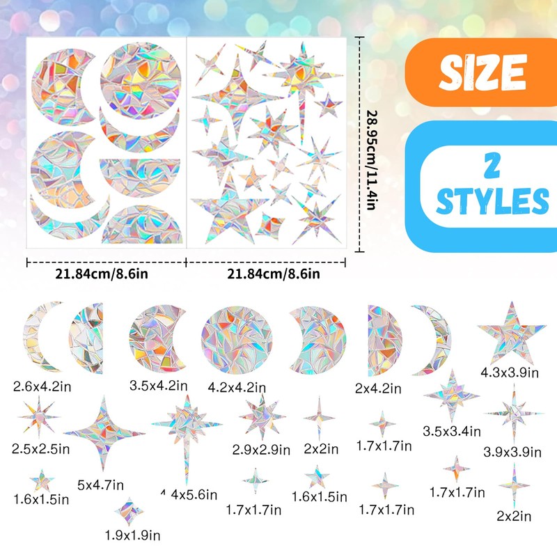 - PACKAGE CONTENT Total 2 sheets of prismatic window stickers. Includes two different sized patterns for a total of 23 stickers. The stickers are available in different sizes from about 1.2 to 5.5 inches.