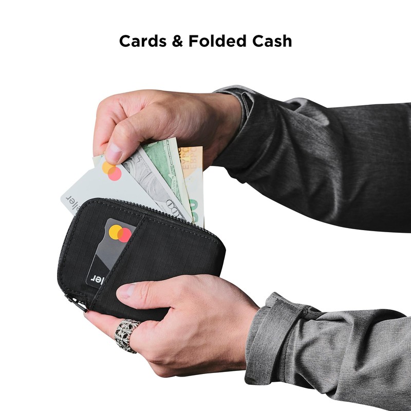 - Pocket-Sized Minimalist Wallet For Men and Women: Great for storing cards, coins, and loose cash, the Zip Card Pouch offers multiple organization options. The front external slot fits a commuter card or whatever else you need handy perfectly and a zippered compartment with 2 internal pockets to hold 12 to 20 cards.