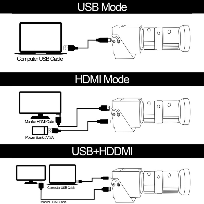 • USB and HDMI Simultaneously Output:4K USB&HD-MI Camera, USB plug to laptop, meantime connecting port for monitor, two screen display simultaneously. In addition,this camera support 3 Display Modes.