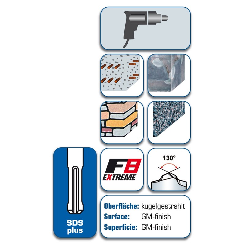- Suitable for all standard SDS plus drills from Hilti, Bosch, Makita, Hitachi, Fein, AEG, Metabo, DeWalt, Black & Decker, Brüder Mannesmann, Kress, Wolfcraft, Einhell, Milwaukee, Flex and much more.