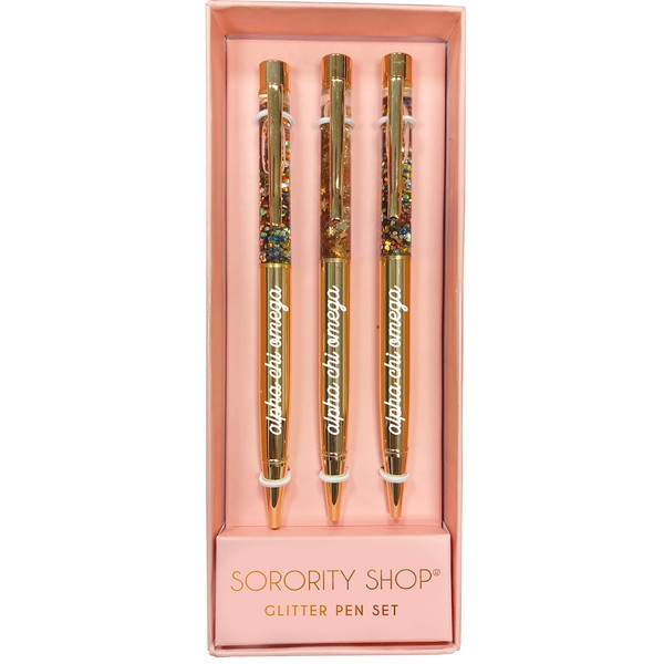 Why write with anything other than our super cute Sorority Glitter Pens? Each set comes with 3 gold pens printed in white sorority script; two with floating multicolor confetti and one with gold star glitter! They even come in an adorable box perfect for gifting! Use these pens at events, as bid day gifts, to write sorority notes, or to represent your organization every day in class!