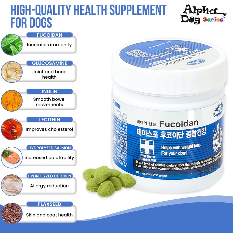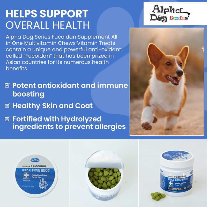 - All-in-1 “Fucoidan Formula” - Alpha Dog Series Fucoidan Supplement All in One Multivitamin Chews Vitamin Treats contain a unique and powerful anti-oxidant called “Fucoidan” that has been prized in Asian countries for its numerous health benefits. It is only found in brown algae such as Kombu, a type of water-soluble dietary fiber. It has been proven to be effective in supporting physical performance, antioxidants, hip & joint, immune, skin/coat, gut health, and overall wellness.