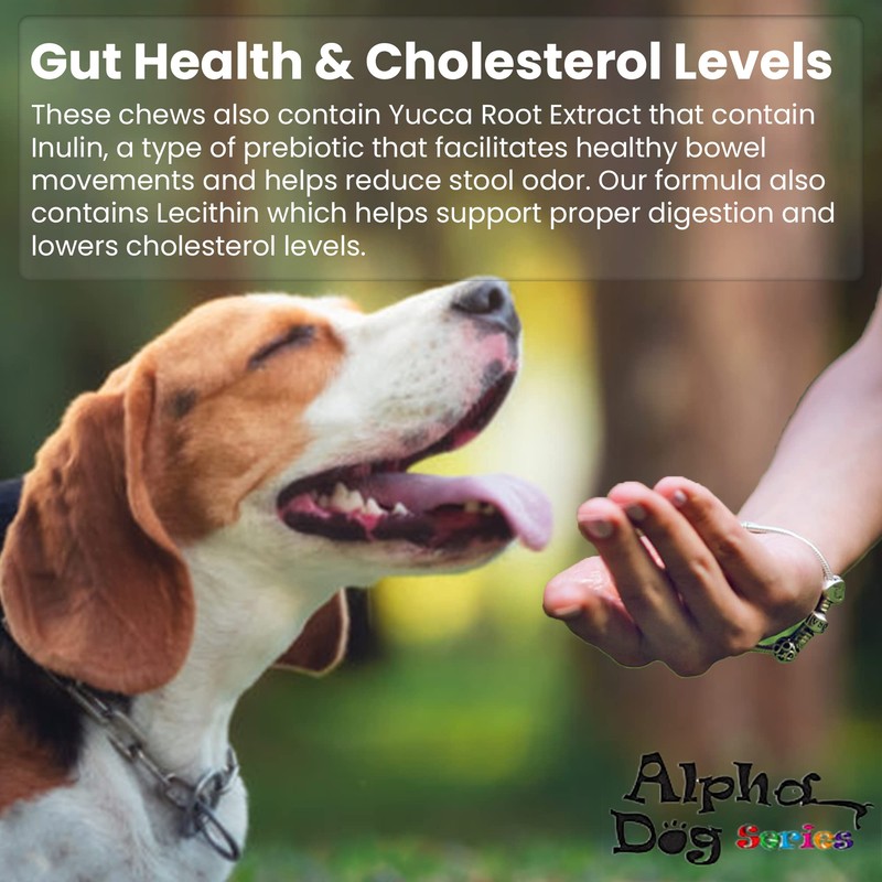 - Gut Health & Cholesterol Levels - These chews also contain Yucca Root Extract that contain Inulin, a type of prebiotic that facilitates healthy bowel movements and helps reduce stool odor. Our formula also contains Lecithin which helps support proper digestion and lowers cholesterol levels.