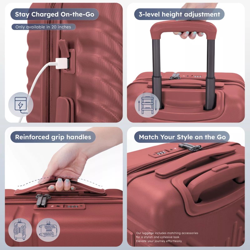 - Features: Anti-Theft, Carry On, Charging USB-Hub, Expandable, Lightweight, Locking, Wheels/Rolling
