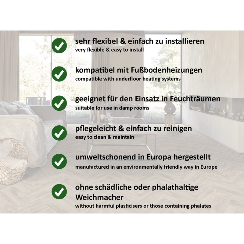 - Easy to clean: the PVC floor covering has a smooth surface finish without coarser joints and is therefore very easy to clean. Thanks to its texture, the vinyl floor conveys a pleasantly soft running feeling and also has a sound-absorbing effect