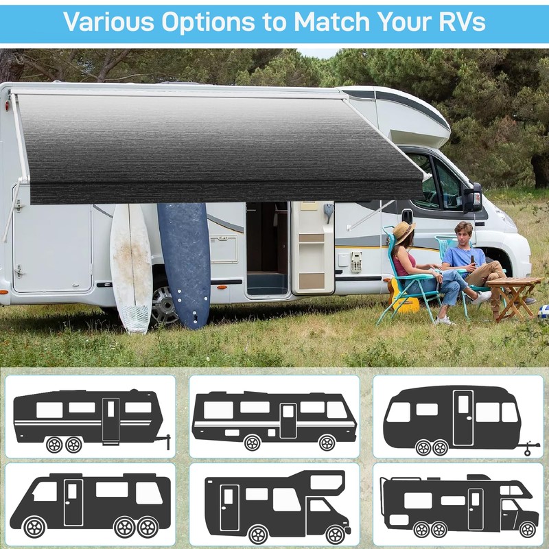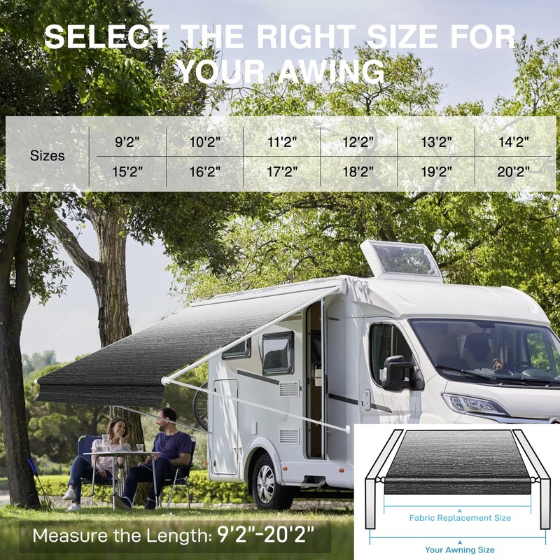 • [Sizing Guide] Our replacement fabric for rv awnings are available in sizes 9'2"C20'2" to fit most RVs. Please be sure to measure measure the distance between the center of the Awning arms from left to right to choose the right size. Eg.If your tralier Awning size is 16', then choose the 16FT(fabric 15'8")for your Awning for camper.