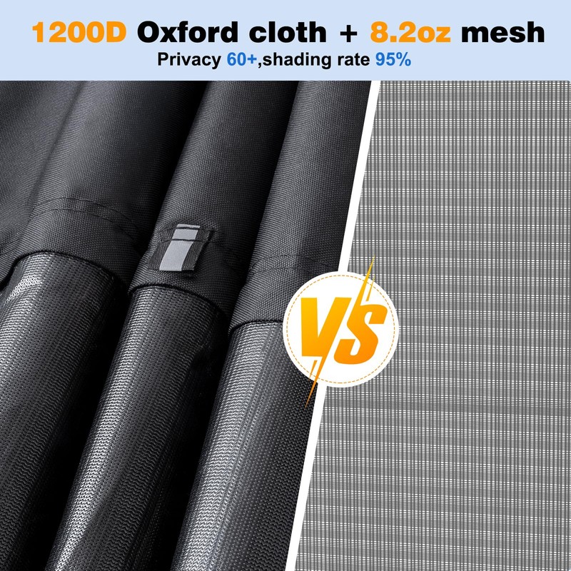 - [Splicing Design-Superior Sun Protection and Privacy] Our RV awning screen is made from heavy-duty 1200D Oxford cloth and 8.2 oz high-density vinyl mesh, providing 95% UV protection, lowering the internal temperature, and maintaining 360° airflow. It offers a lightweight, durable shade, creating a breathable and private outdoor space for you and your family