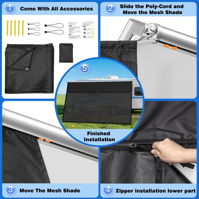 - [Easy Installation - Zipper Design]The AlphabetAcre RV camper awning shade screen features a heavy-duty zipper design that can be installed in 1-2 minutes. The top Oxford fabric and the awning roll into the RV arch shaft, which saves you the trouble of using a ladder to install or remove