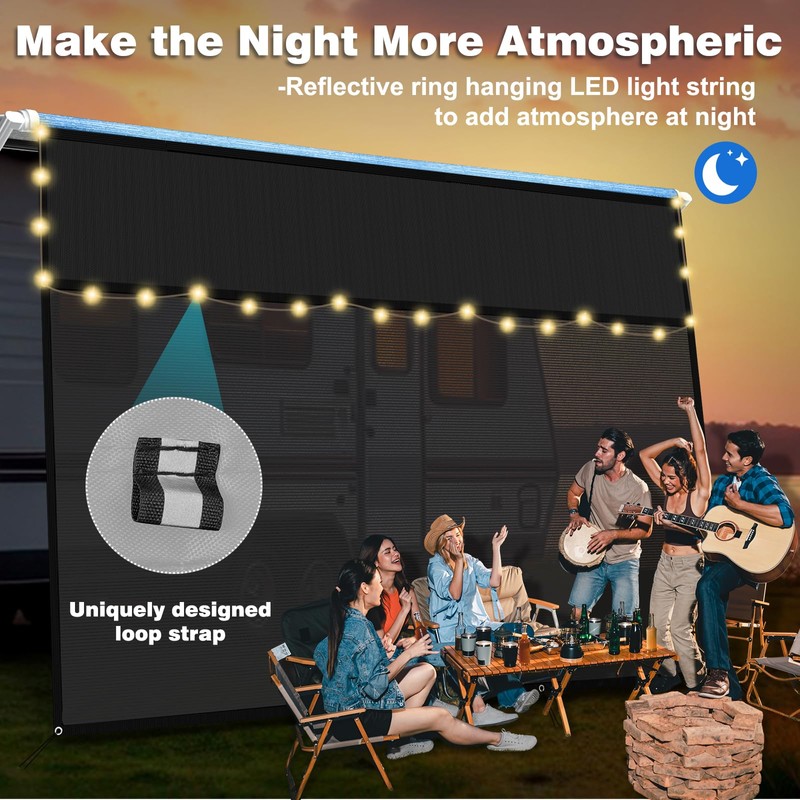 - [Accessories & Support] Camper awning kit includes: rv awning shade screen with zipper *1, long bungees *4, stakes *4, Drawstring storage bag *1,instruction manual *1,card *1.Furthermore, we uniquely pre-installed loop strap to support adding LED light strap if you have any questions, please feel welcome to reach out anytime