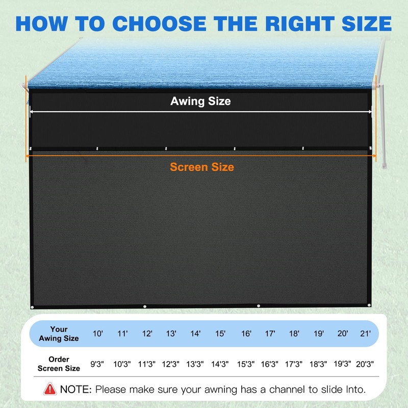 - [Multiple Size Options]Fits 10 ft-21 ft RV sun shade with a 9' 3'' -20' 3'' length by 9' drop (3 ft top oxford fabric + 6 ft bottom mesh screen),Compatible with most awning brands, such as Carefree, Dometic, Lippert, Fiamma, Solera, and Carter,Tip: Please ensure that the length of the RV awning sunscreen you order is shorter than the length of the awning frame