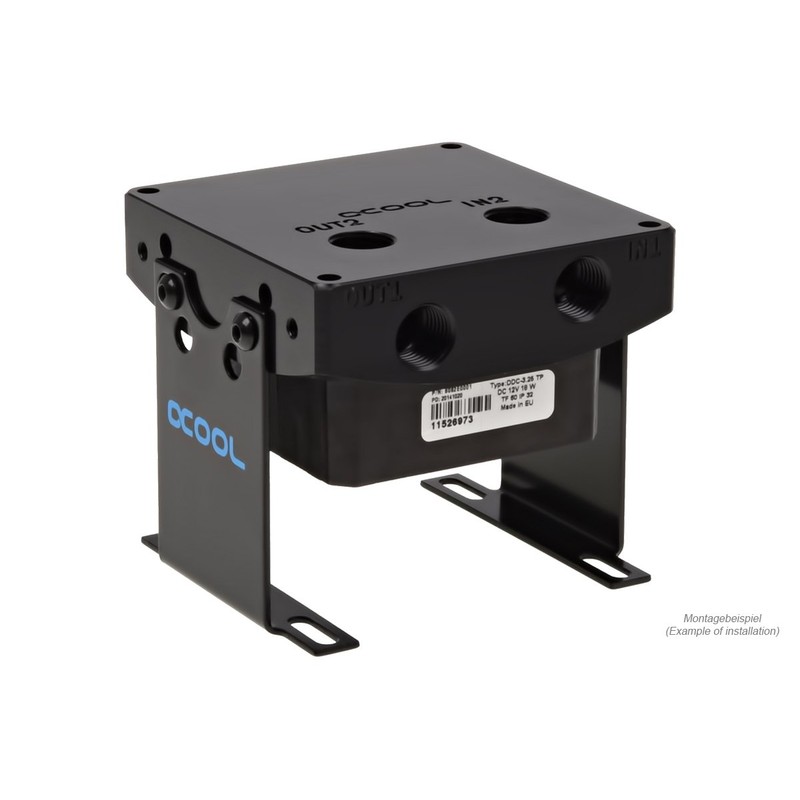 The tried and tested Laing DDC attachment is now available in the new design. For years, this attachment has been a benchmark. Small improvements have been made time and time again. The first big update differs both visually and technically in a few details. The principle: on the bottom there is space for the Laing DDC pump separated from the original attachment and on the front or on the top inlet and outlet. For even more flexibility, the ice blanket has three inlets and two outlets. Another feature is the new holder to give the whole unit a stable stand and complete the overall optical picture. Optional mounting in the 3.5 inch slot is still possible. The attachment can be converted into a complete expansion tank with the help of the expansion tank attachment, which has also been revised. Technical data: dimensions: 80 x 80 x 23 mm, material: acetal connections: 5 x 1/4 inch thread, box contents: 1 x Alphacool ice cover Laing DDC acetal attachment V.2, 3 x locking screw 1/4 inch, 2 x feet mounting material, instructions for installation: after installation, a small gap remains between the pump and the lid. The tightness is given as the O-ring is a form-fitting connection. Therefore, the screws are not too tight, it can cause damage to the lid.