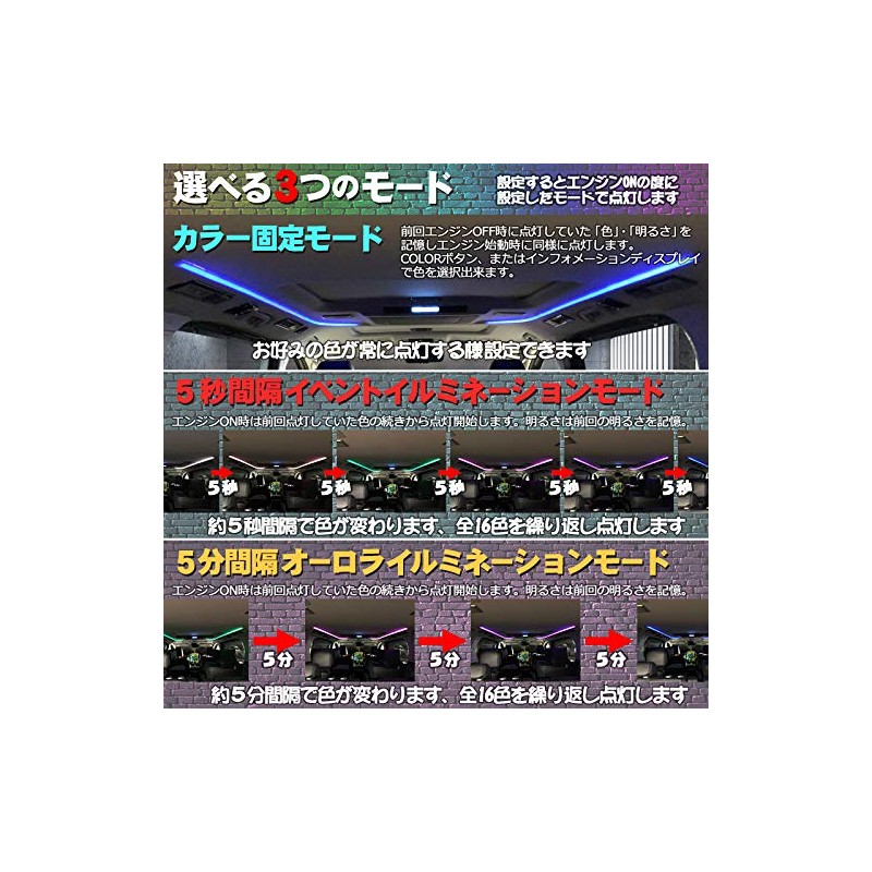 - Changes from the old version due to improvements; When the product is installed, changes will not be saved even if the brightness is changed with the steering switch. If you want to save the brightness change, please change the brightness by the ROOM button in the back seat. The color can be changed and stored with the steering switch. When the ROOM button is set to turn off the light, it will be 100% brightness when the engine is on. If you want to set it to off, please switch the function of the product to OFF