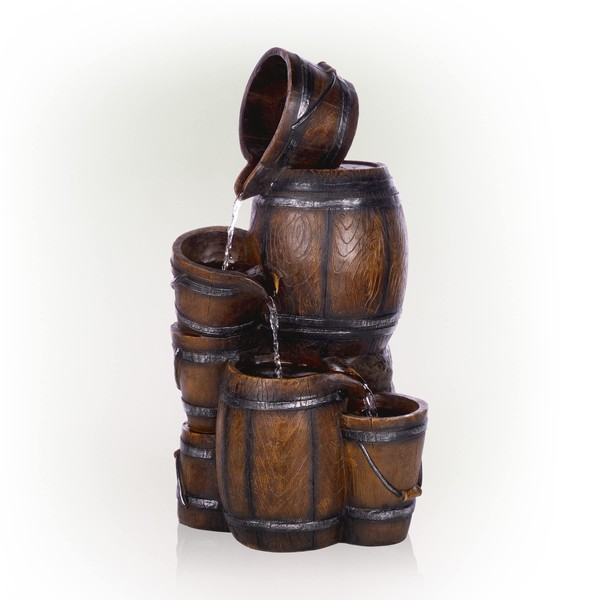 - INDOOR/OUTDOOR TIERED FOUNTAIN: Features four tiers of rustic barrels and buckets with an interior pump that keeps the water flowing - just plug it in!
