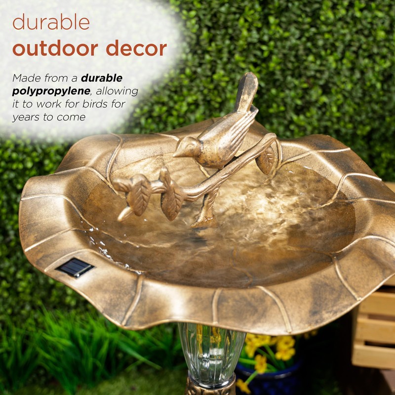 - 1-Year Warranty for Assurance:Backed by a warranty, the Solar Gold Birdbath with Birds and LED Light provides customers with assurance regarding its quality and durability. This warranty underscores the manufacturer's commitment to customer satisfaction and product reliability. With Alpine's 1-year warranty, you can Shop With Assurance and Buy With Confidence.