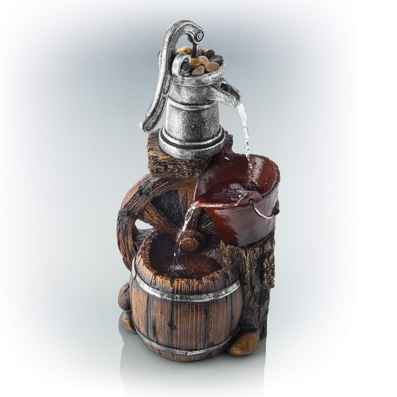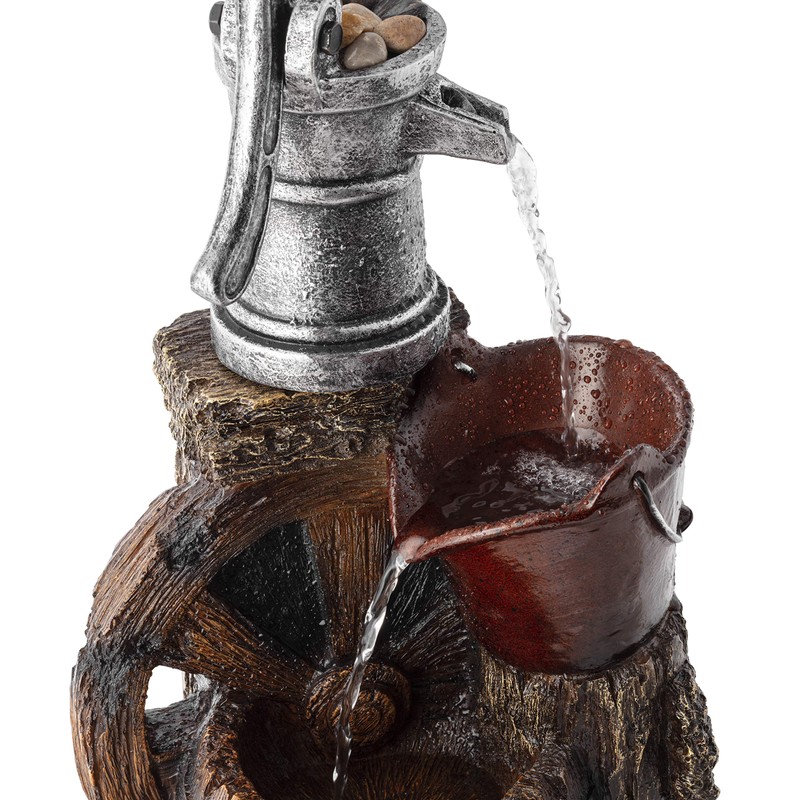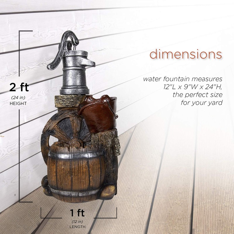- RUSTIC LOOK: Fountain includes pump, bucket, barrel, stone, and wagon wheel elements for an old-fashioned western feel