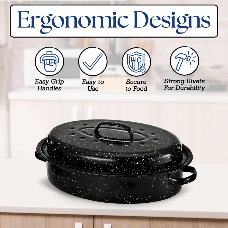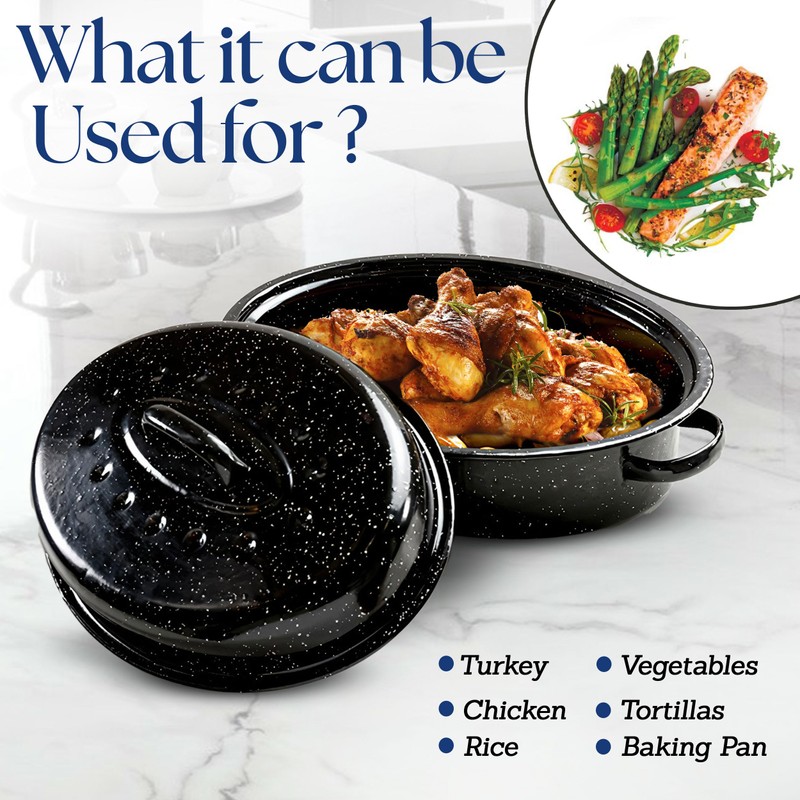 - ALPINE CUISINE OVAL ROASTER: An Alpine Cuisine roasting pan with a lid and handle promotes healthier cooking. This 13-inch enamel roasting pan wonder offers consistent heat distribution and is made of sturdy carbon steel. Ideal for regular cooking, it makes meal preparation easy by streamlining sauces, soups, vegetables, grains, and beans while encouraging healthy cooking.