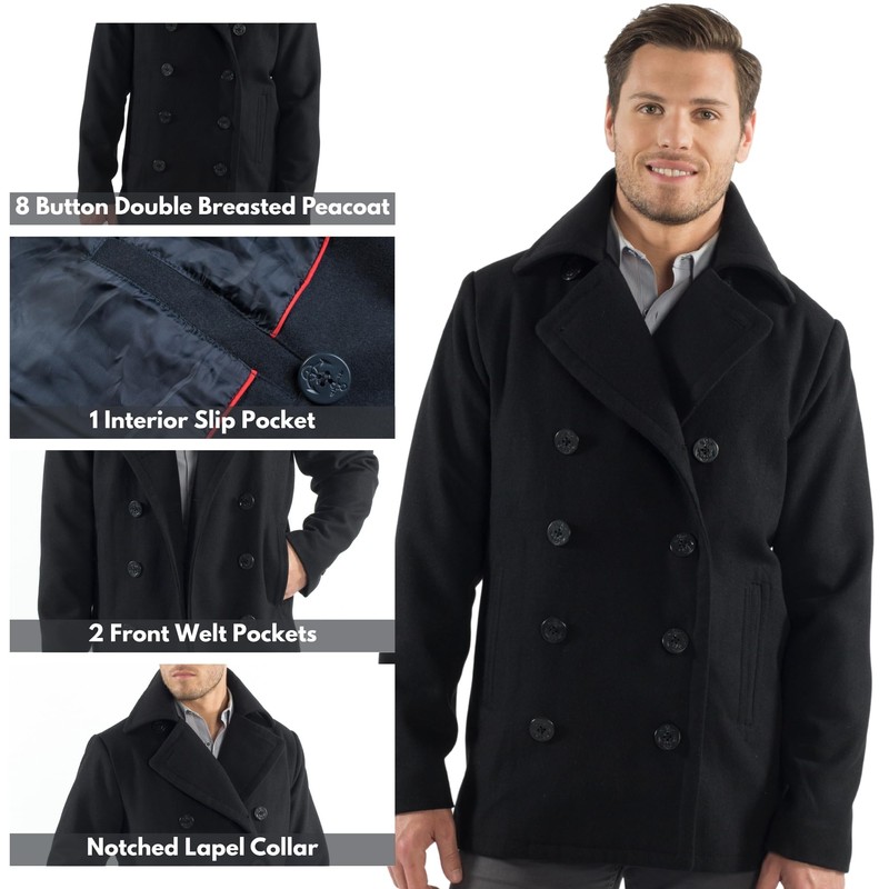 • DESIGN – The Mason Peacoat features a classic double breasted 8 button design with a notched lapel collar, 2 front welt pockets, and 1 interior chest slip pocket. The coat can be buttoned closed from the left or right side.