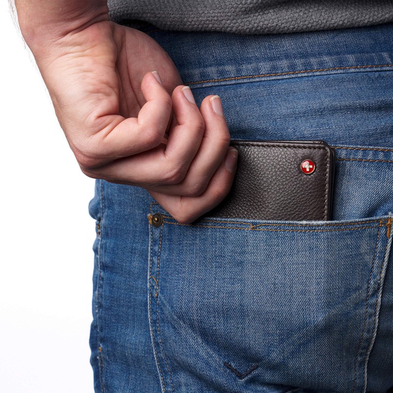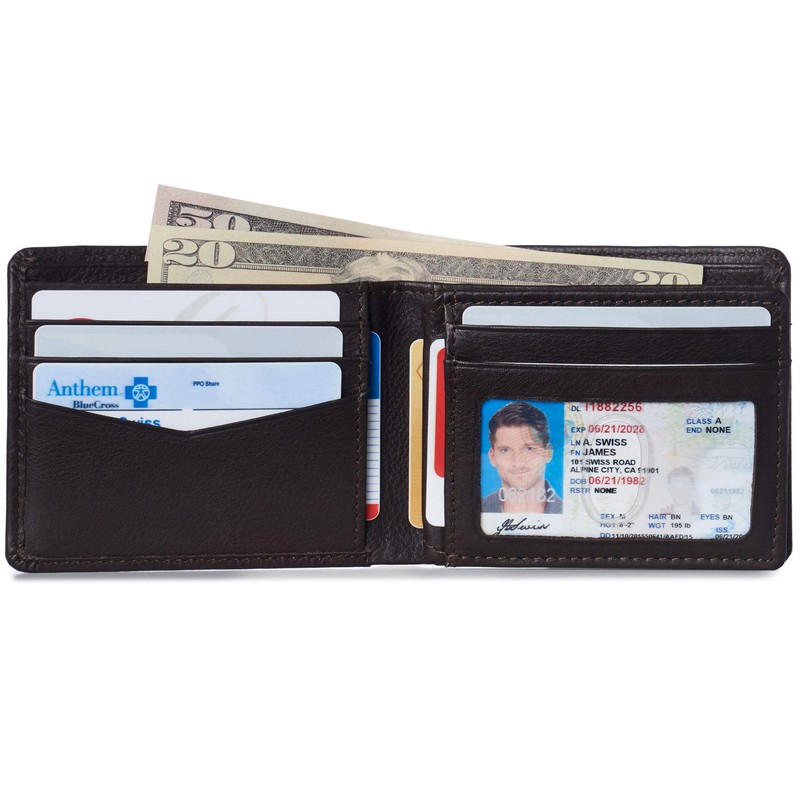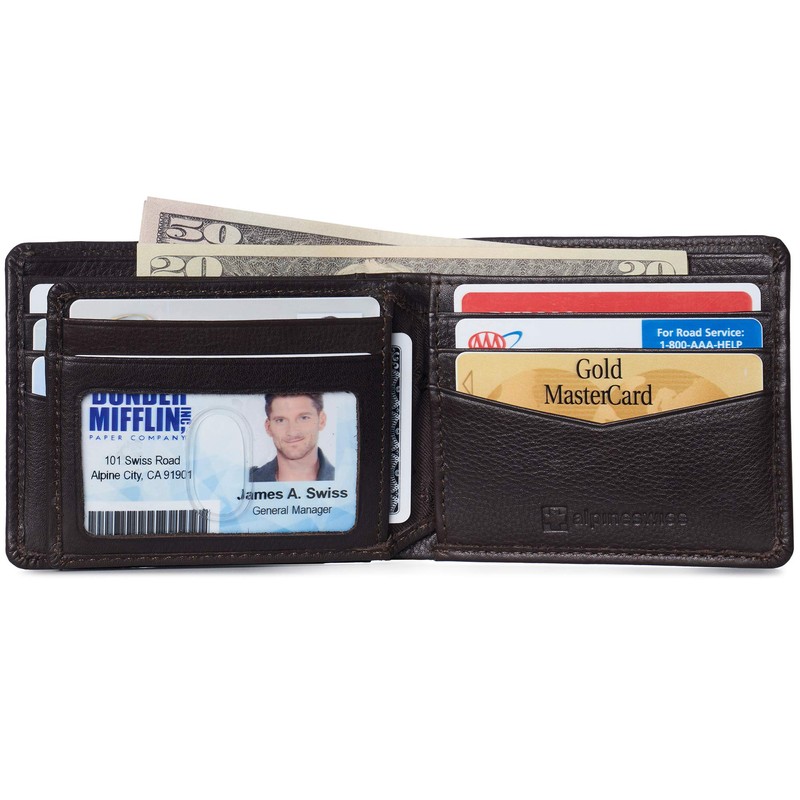Nolan RFID Commuter Wallet By Alpine Swiss Product Features: Genuine Leather NOLAN COMMUTER – MSRP $45 – We’ve updated the classic bifold design with a center flip dual ID window to create the modern commuter bifold wallet. The Nolan Commuter bifold features a divided double bill section making it easy to separate large and small bills. After a few weeks of use, this genuine leather wallet will begin to stretch and conform according to your needs, just like an expensive pair of leather shoes. Card slots are designed with ample enough room to fit 2 cards in most. FUNCTIONAL – Measurements: 4 1/2" L x 3 1/2" W x 5/8" H. Divided lined bill section, 2 ID windows, 8 horizontal credit card slots and 4 vertical pockets. Pro Tip – 4 vertical pockets under the card/ID slots add more carrying capacity great for receipts, cards or folded bills. YORK COLLECTION– Original classic line accented with our embossed logo. Comes in a black Alpine Swiss gift box. The York Collection features dressy traditional leathers that are ethically sourced and processed using sustainable eco-friendly methods. SOFT NAPPA LEATHER – The Nolan RFID Commuter wallet is skillfully crafted from quality genuine cowhide nappa leather. The barely-there pebble grain texture is buttery soft to the touch making it both luxurious and pliable to easily conform to fit multiple cards per slot. A perfect wallet to match your personal style. Fine craftsmanship and high-quality genuine leather make this wallet a durable companion that will age beautifully.  RFID PROTECTED: Certified independent lab tests in Met Labs Santa Clara, CA facility. Secure your personal data for credit card RFID chips operating at 13.56 MHz frequency while allowing use of 125 KHz proximity cards such as ID badges, hotel cards & some transit cards.