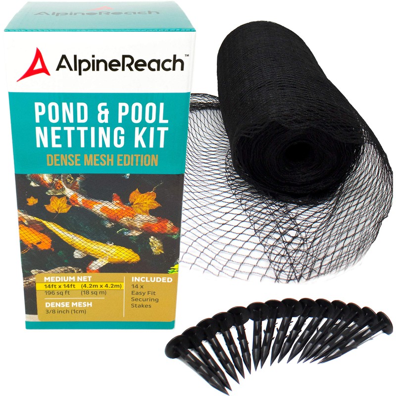 14 ft x 14 ft Pond & Pool Netting: Durable Fine Mesh Our Pond & Pool Netting: Durable Fine Mesh is so tightly woven it will stop the smallest leaves from falling through the net. It passes the penny drop test and the coin will not slip through! The dense mesh offers extra high tensile strength – suited to ward off predators from your fish. Choose AlpineReach for high quality products. The Ideal Pond & Pool Protection Netting Simple to setup 3/8 inch Heavy Duty Mesh Protection Heavy Duty Floating Net 300 square feet Net Approx. 1 lbs Net Protect Fish against predators Designed to capture small leaves 14 x Stakes included for securing net Netting Tip: When placing the net try to keep the length at 14ft or less. Stretching the net lengthwise will cause the width to go smaller than 14ft because of the diamond shaped mesh. Note: do not use as a swimming pool safety net