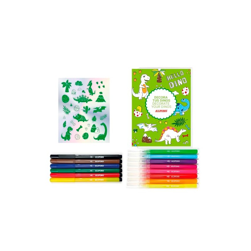 - Contains: 18 illustrated sheets of dinosaurs, decorative stickers, 6 alpine markers and 8 fluomarkers.