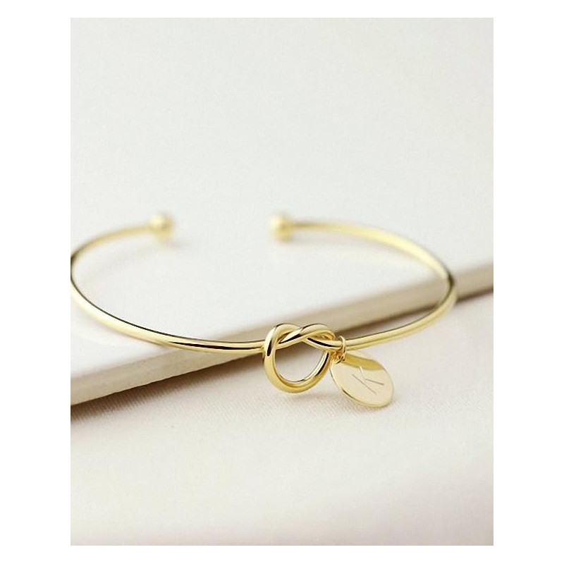 - Product Description:Elegant and trendy gold knot bracelet with customizable initial charm, perfect for adding a personal touch to your style.