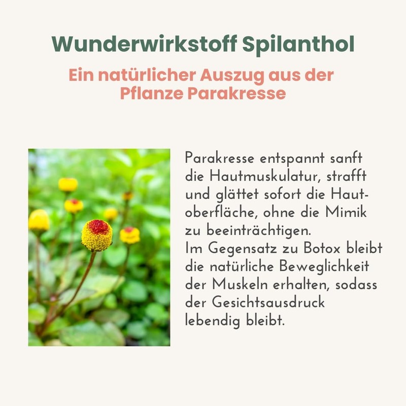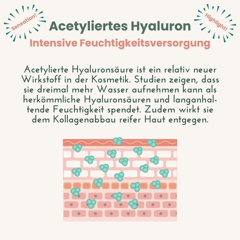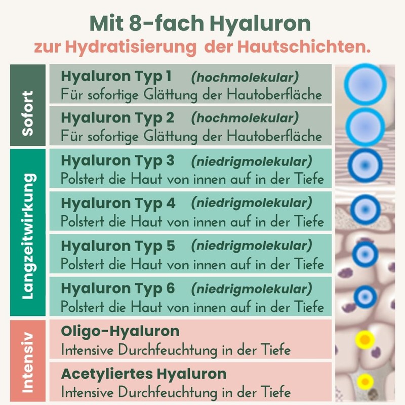 • Intense moisture plus smoothing plus radiance. Highly efficient intensive serum with a multifunctional active ingredient complex. 8-fold hyaluronic acid for intense moisture in different skin layers and a fresh and plump looking skin. Spilanthol, also called vegetable botox, helps to tighten the skin and reduce facial wrinkles. Vitamin C has a brightening effect and prevents pigment disorders. Fine lines are reduced. Suitable for all skin types.