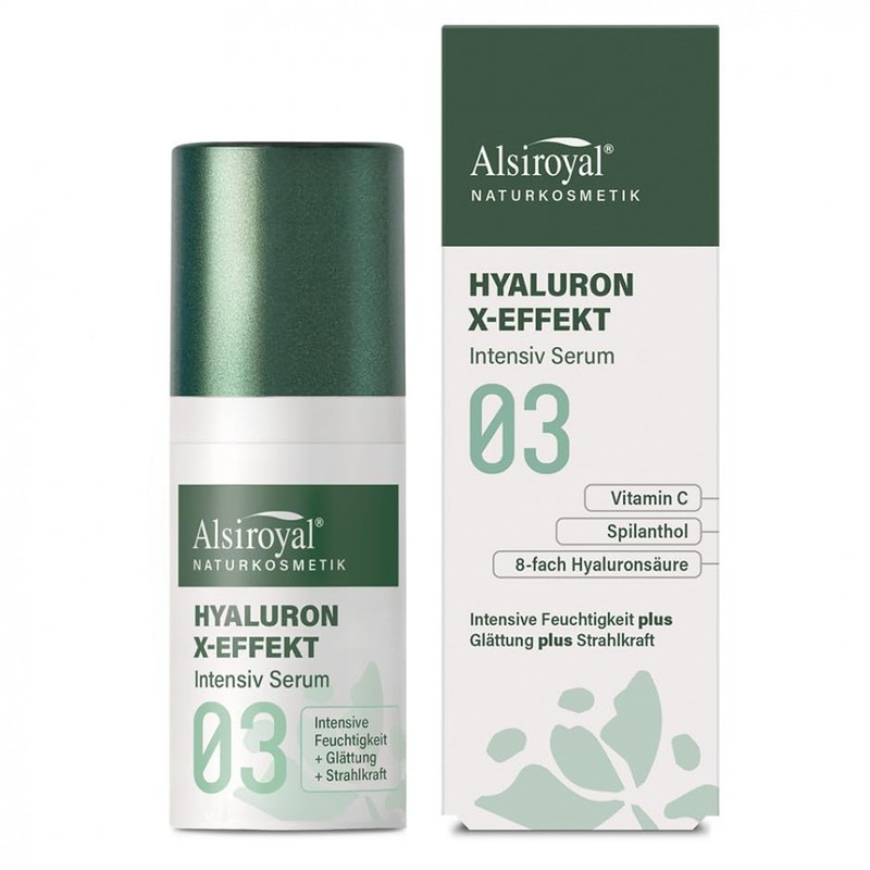 Vitamin C spilanthol 8-fold hyaluronic acid, intensive moisture plus smoothing plus radiance. Hyaluronic X-effect relies on the multifunctional combination of an 8-fold hyaluronic complex and selected ingredients - for a plus effect. Designed to intensively moisturise the skin and noticeably soften the signs of ageing. Alsiroyal natural cosmetics your expert for effect. For over 75 years, our company has relied on the effects of nature. The result: certified natural cosmetics with optimally coordinated, clinically tested active ingredients to achieve sustainable anti-ageing effects and skin improvements. For healthy-looking, naturally radiant skin. Sustainable packaging made from recycled cardboard 100% recyclable pump dispenser intensive serum: a highly efficient combination of active ingredients for intensive moisture, smoothing and radiance. Vitamin C gives the skin new radiance, brightens and prevents pigment disorders. It supports the skin's own collagen build-up and noticeably reduces fine lines. Spilanthol, the extract of paracress (Acmella oleracea), also called vegetable Botox*, helps to visibly tighten the skin and reduce facial wrinkles. Ideal for smoothing crow's feet, forehead and mouth wrinkles. 8-fold hyaluronic acid for intense moisture in different skin layers: high and low molecular weight hyaluronic acids can cushion wrinkles from the inside out and leave the skin looking fresh and plump. *The brand name Botox is exemplary for preparations containing botulinum toxin. Our quality promise: certified natural cosmetics. Our products carry the Neuform seal, certified by the Neuform Quality Institute. They meet 100% the strict criteria for vegan, tested for harmful substances premium natural cosmetics and are characterised by their naturalness, purity and safety. Dermatological tests confirm skin compatibility. From your health food store. Vegan quality. (Seal)