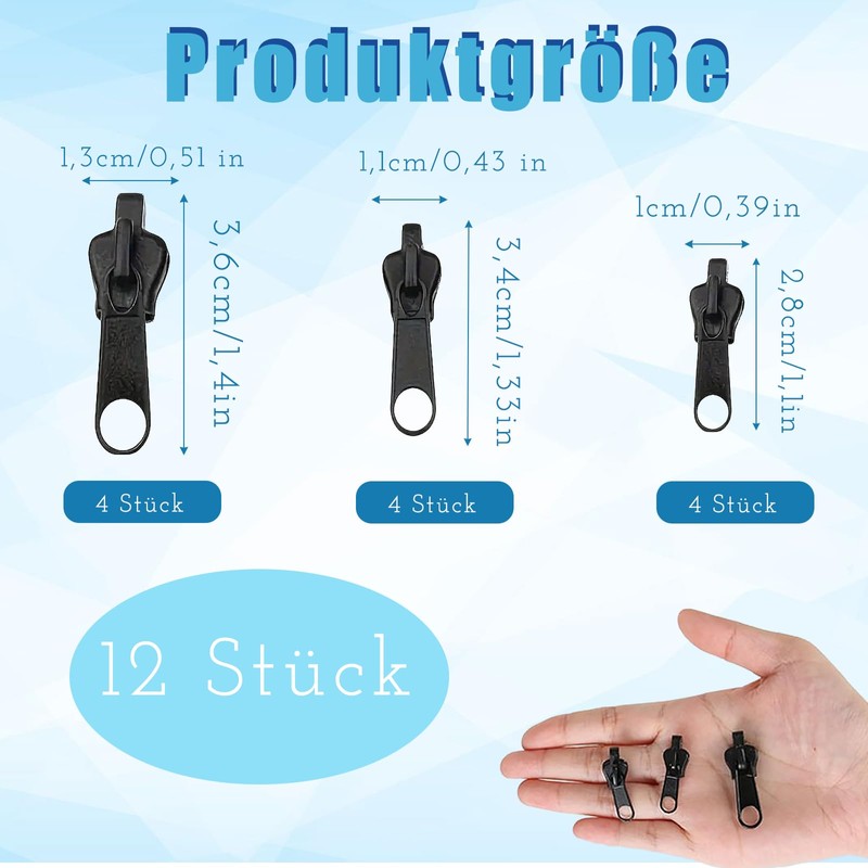- Product dimensions: this zip repair set contains 12 zips. Available in three different sizes (3.6 cm/3.4 cm/2.8 cm), four of each size are included. Different sizes meet your requirements for repairing different items and these sizes are perfect for zippers of frequently used items.
