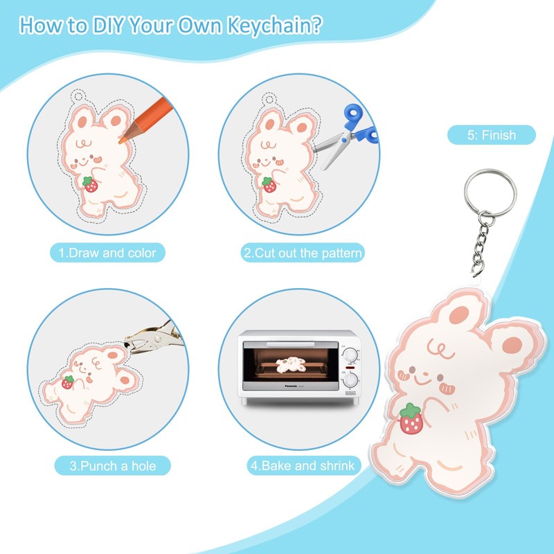 - Versatile accessories: this set contains everything you need for your craft projects. It includes a selection of shrink films in different shapes and sizes, colourful pens for painting and decorating, practical tools such as hole punches and open rings, as well as a variety of accessories such as key rings and chains.