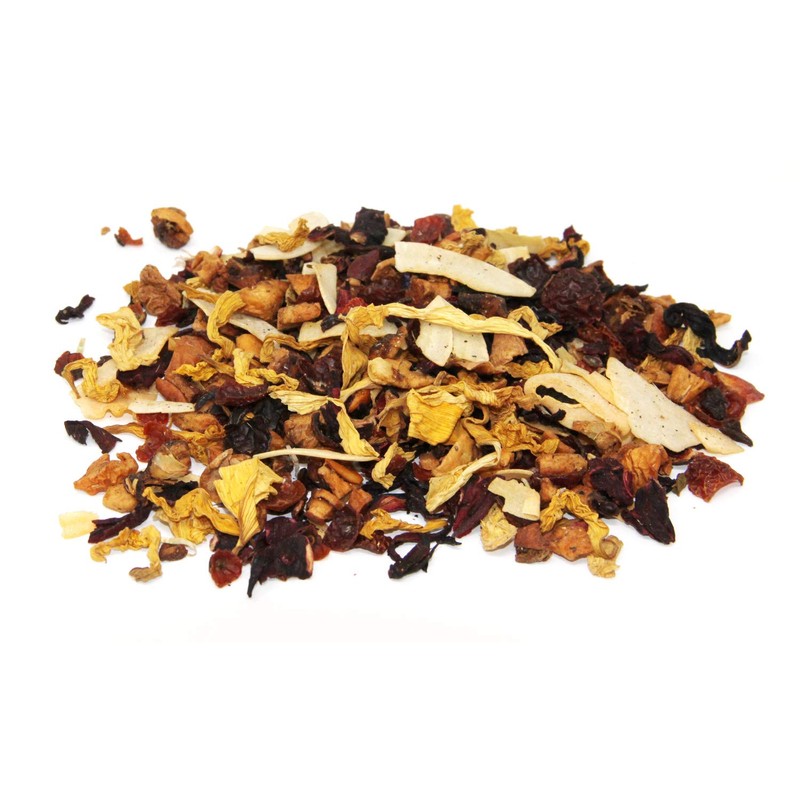 - Ingredients: apple pieces (49%), rose hip peels, hibiscus flowers, coconut chips, aromas, sunflower blossoms, cornflower blossoms.