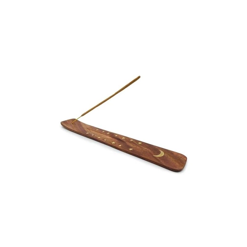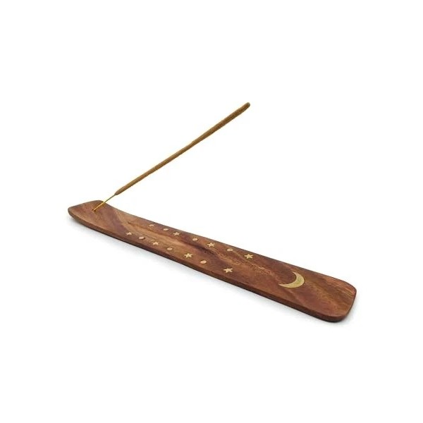 - SIMPLE & ELEGANT - This incense stick holder features a classic celestial design. The ash tray is sanded for a smooth finish, and the brass inlays provide a striking contrast with the natural wood grain.